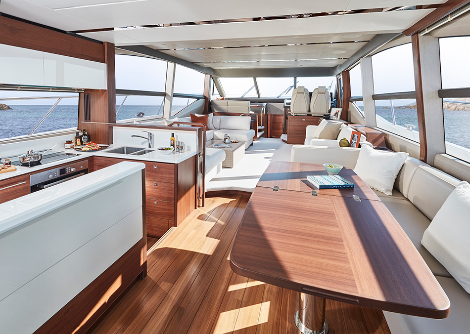 Inside, her appeal becomes all the more alluring. An aft-galley layout is perfectly placed to serve the cockpit, with triple sliding doors and an electrically opening aft window. Expansive areas of glass allow light to pour into the saloon, with the helm enjoying raised L-shaped seating to port for a more social journey. The master stateroom has a private stairwell and lobby, whilst guests enjoy a separate stairwell and three class-leading cabins.