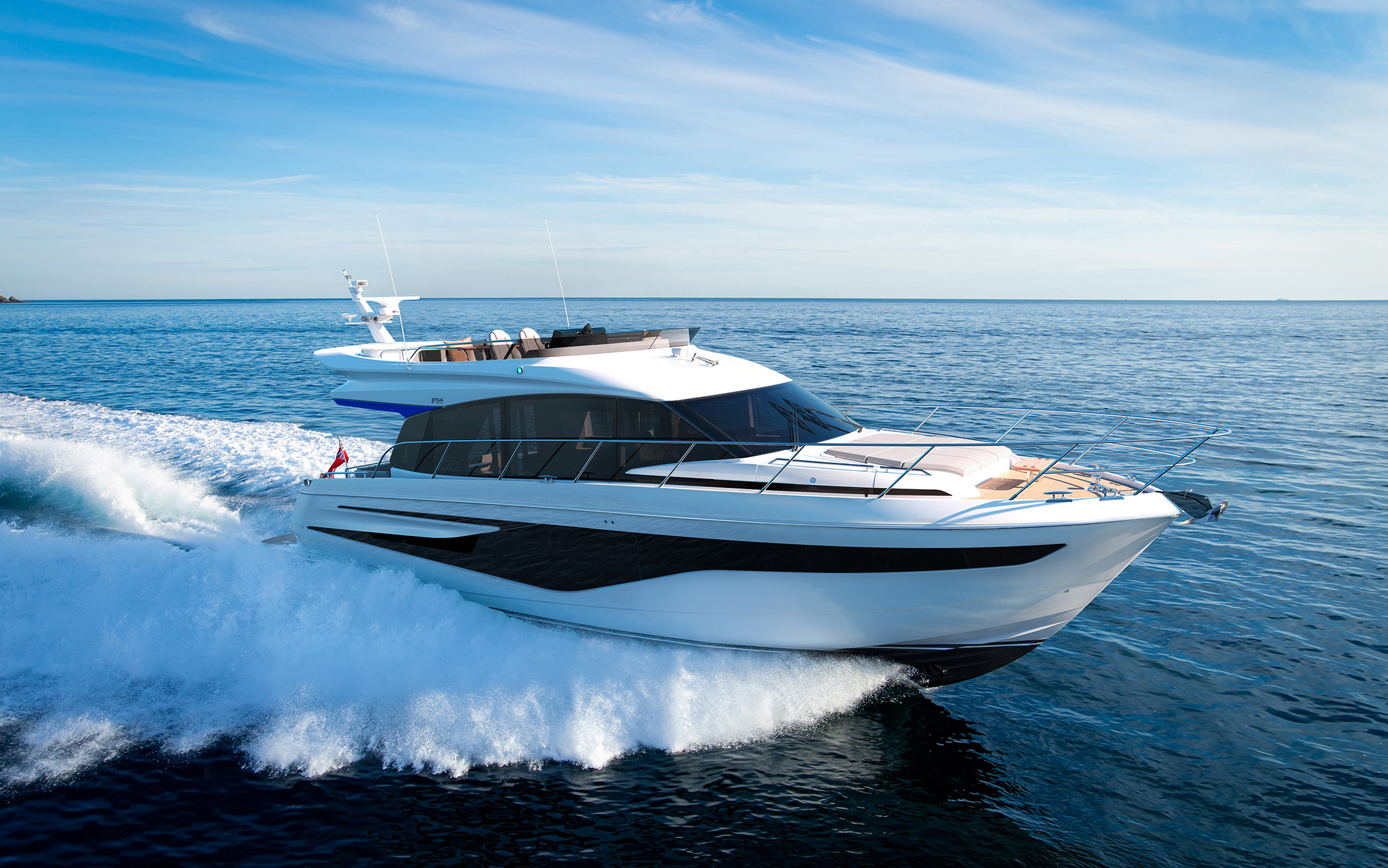 - The latest addition to the F Class range, the new F54 makes life on the water effortless. With a foredeck sunpad, a new flybridge layout with companion seating, a walkaround-style transom and an optional linear bathing platform suitable for a tender, it’s perfect for socialising – or just relaxing.